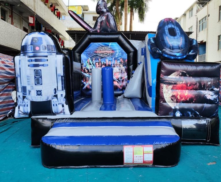 Structure gonflable STAR WARS DIMENSIONS HORS MANCHON A AIR (derriere la structure): PROF : 5M LARG : 5M HAUT : 3.5M 110KG NOMBRE PARTICIPANTS : 8 max dans le gonflable AGE : de 3 à 77 ans.